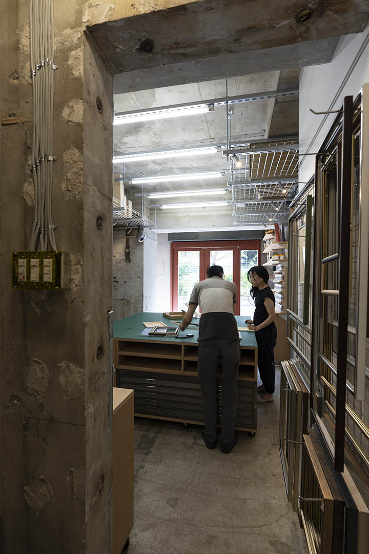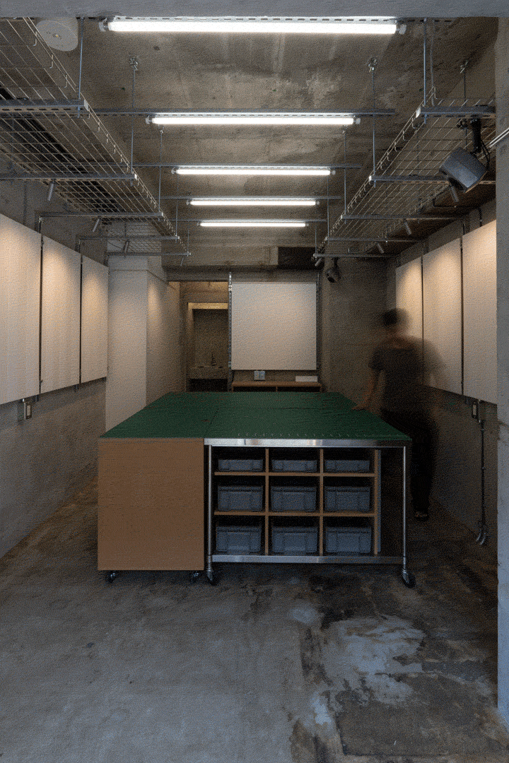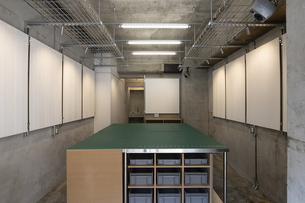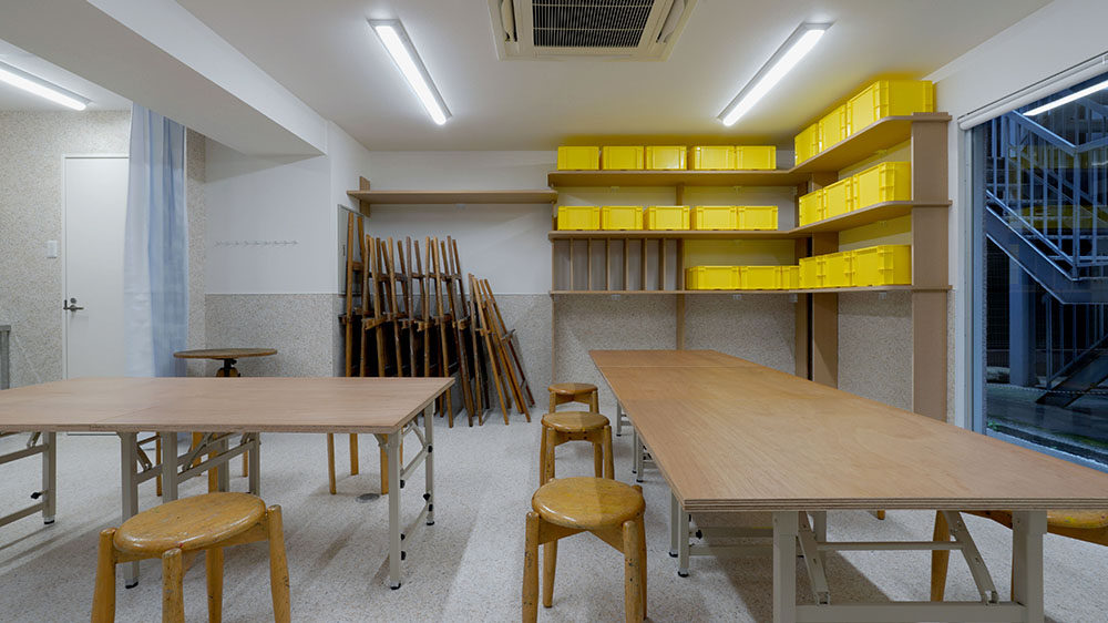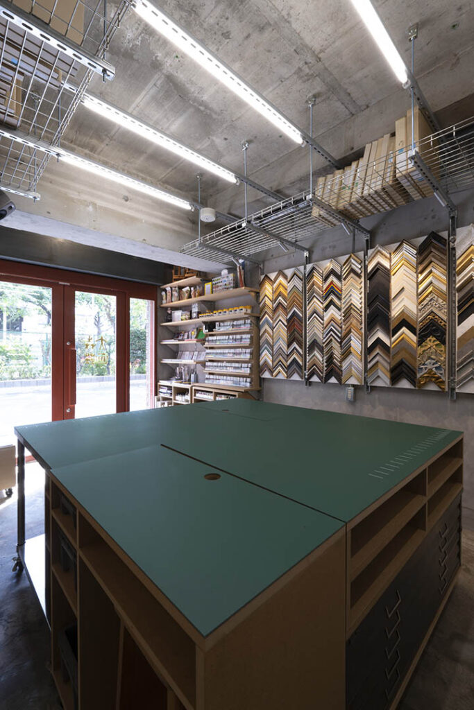 Finding a location of similar size in the heart of Ōmori proved challenging, but the first floor of a 42-year-old reinforced concrete apartment building adjacent to the original site was ultimately chosen. By dividing the programme into two units—a framing workshop and an art classroom—they were able to remain in the area.
