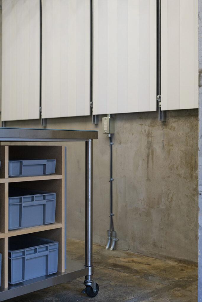 これらの機能を成立させるため、荷重を考慮し、工業材を独自に組み合わせ設計する必要があった。本来隠れるはずの下地材や構造材をデザイン要素の視点で選定し、配線・収納・展示・照明・音響を一体化させた。