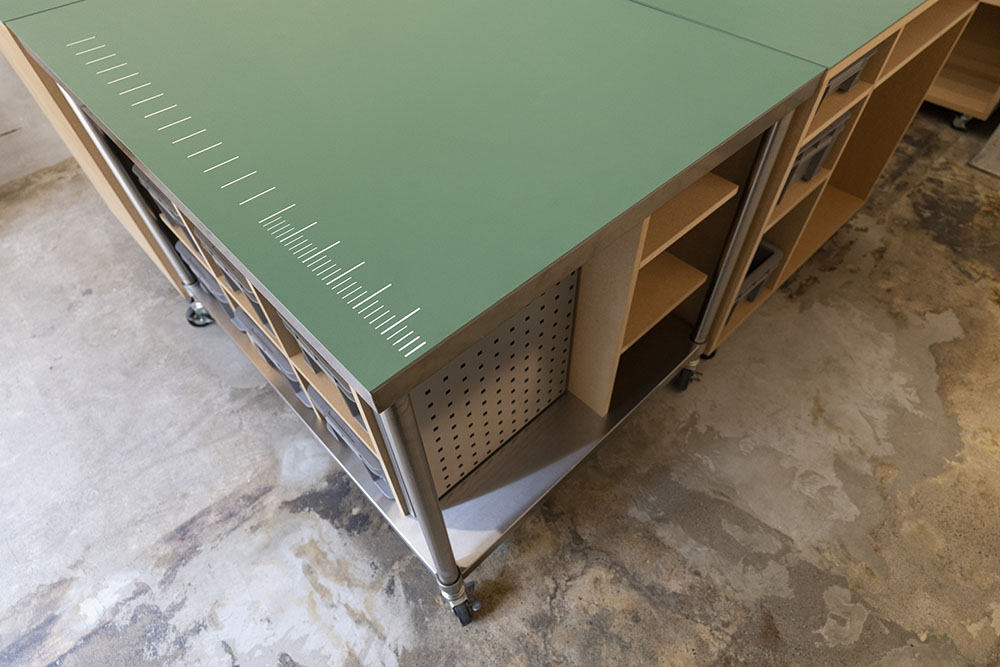 旧店舗では通行人や来客の目に触れない場所に配置されていたが、新店舗ではあえて室内中央に据える計画とした。これらを4つの異なる機能を持つ作業台として一体化し、可動式什器として設計。4台を組み合わせて大きな1台とすることで、多様なスケールの額装に対応できる。展示会開催時には、それぞれを分離し、自由な配置で稼働可能とした。