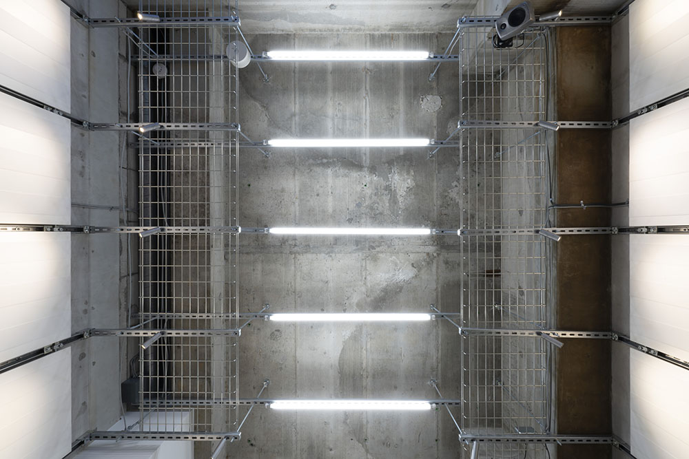 さらに、この配線什器となる吊構造体には照明と音響設備が取り付けられ、室内のすべての配線は、この什器ルートによって隠されつつ接続されている。