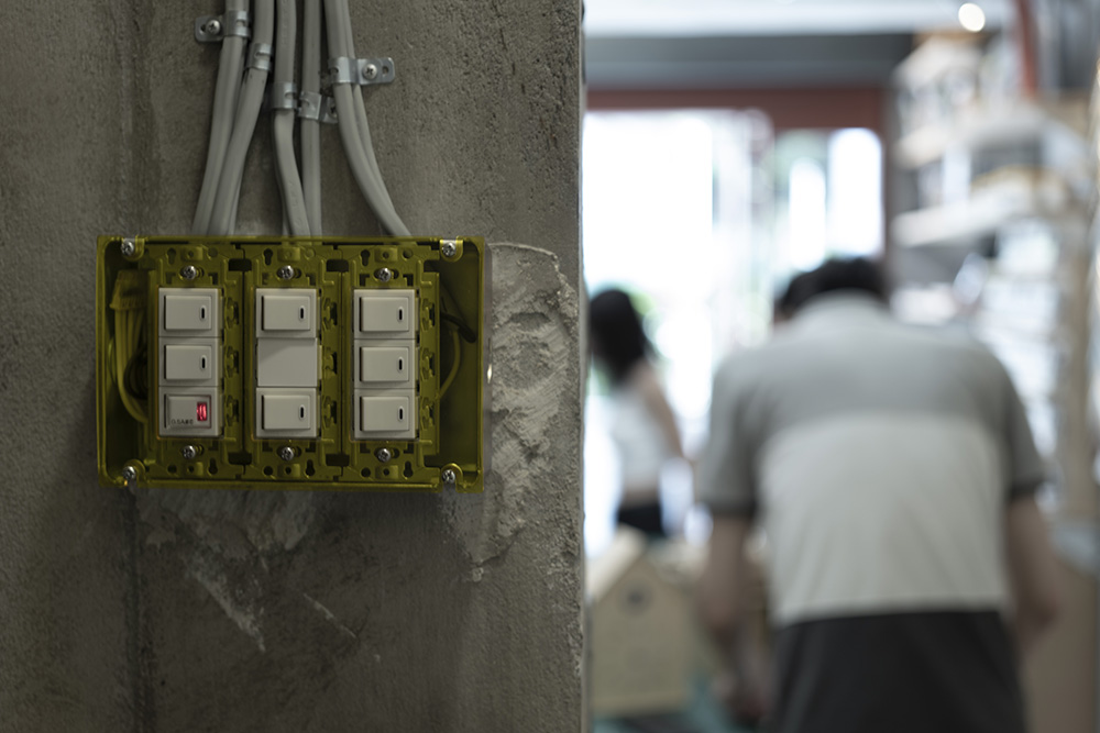 The framing workshop retains an exposed reinforced concrete shell and employs an off-site construction approach centred on factory fabrication. This kept on-site work to a minimum, reducing the construction period and improving cost efficiency. For wall panels, storage units, and lighting, duct rails, suspension fittings, and MDF panels were combined to create a hanging structure, keeping the floor free to allow for varied production scales and flexible working styles.