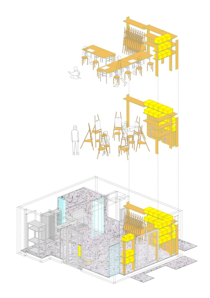 The art classroom retains its original office configuration with minimal refurbishment, ensuring flexibility to accommodate seven different classes. Furthermore, the workshop’s back area and the classroom’s floors and walls use recycled boards made from plastic and paper, reflecting a commitment to sustainability.