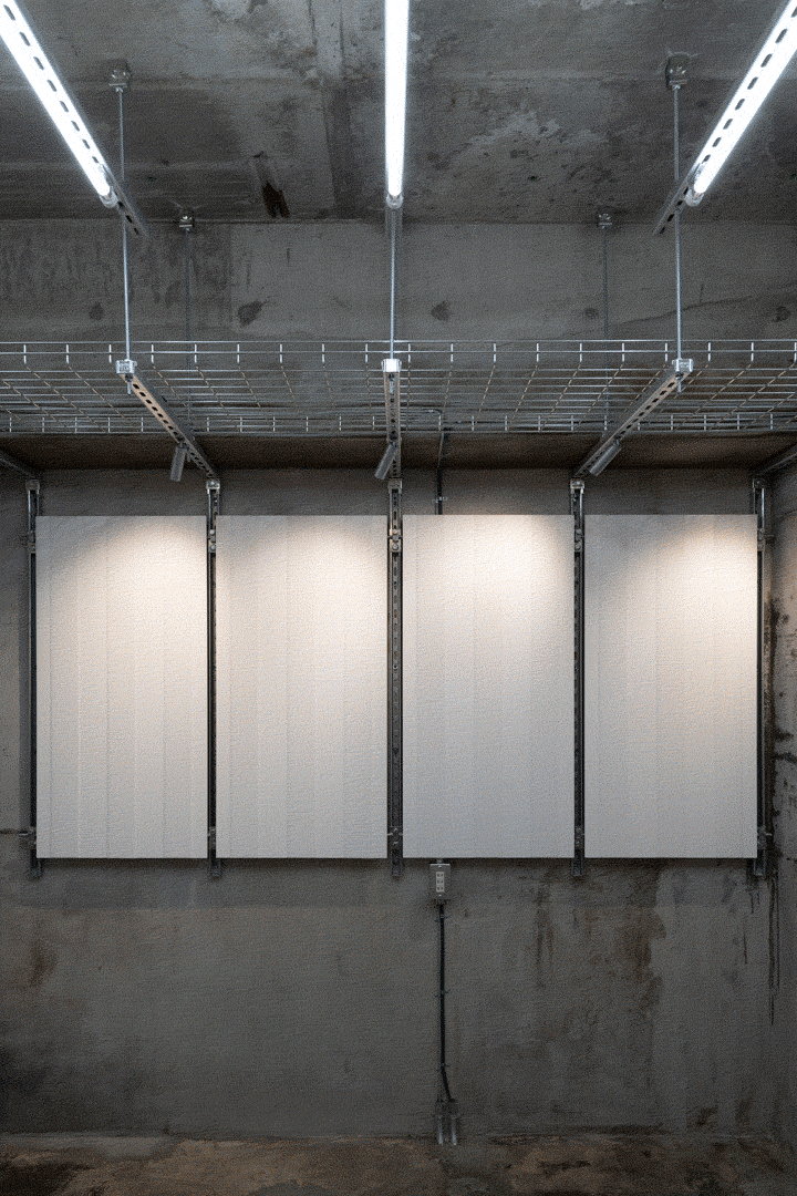 壁面パネルも容易に支柱から取り外すことができる。パネルへは脱着式の多様な額縁材サンプルが自由に彩られる。展示会開催時には、他のパネルへ交換や、パネルを外してRC壁面の活用も可能で、可変性を持ったつくりとした。